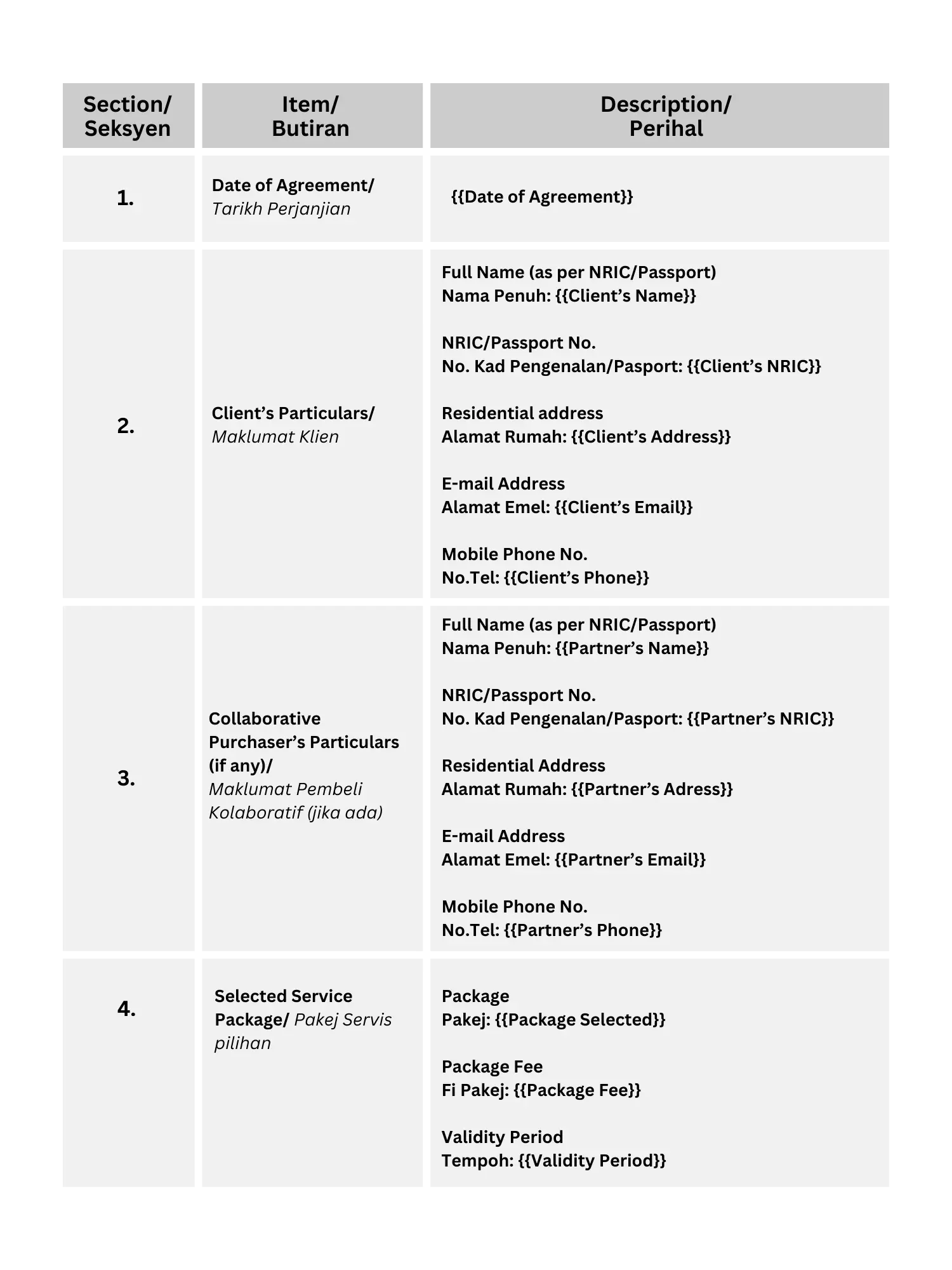 Klien yang butir-butirnya, iaitu {{Client’s Name}} (No. K/P: {{Client’s NRIC}}), seperti yang dinyatakan dalam Seksyen 2 Jadual Pertama (“Klien”).