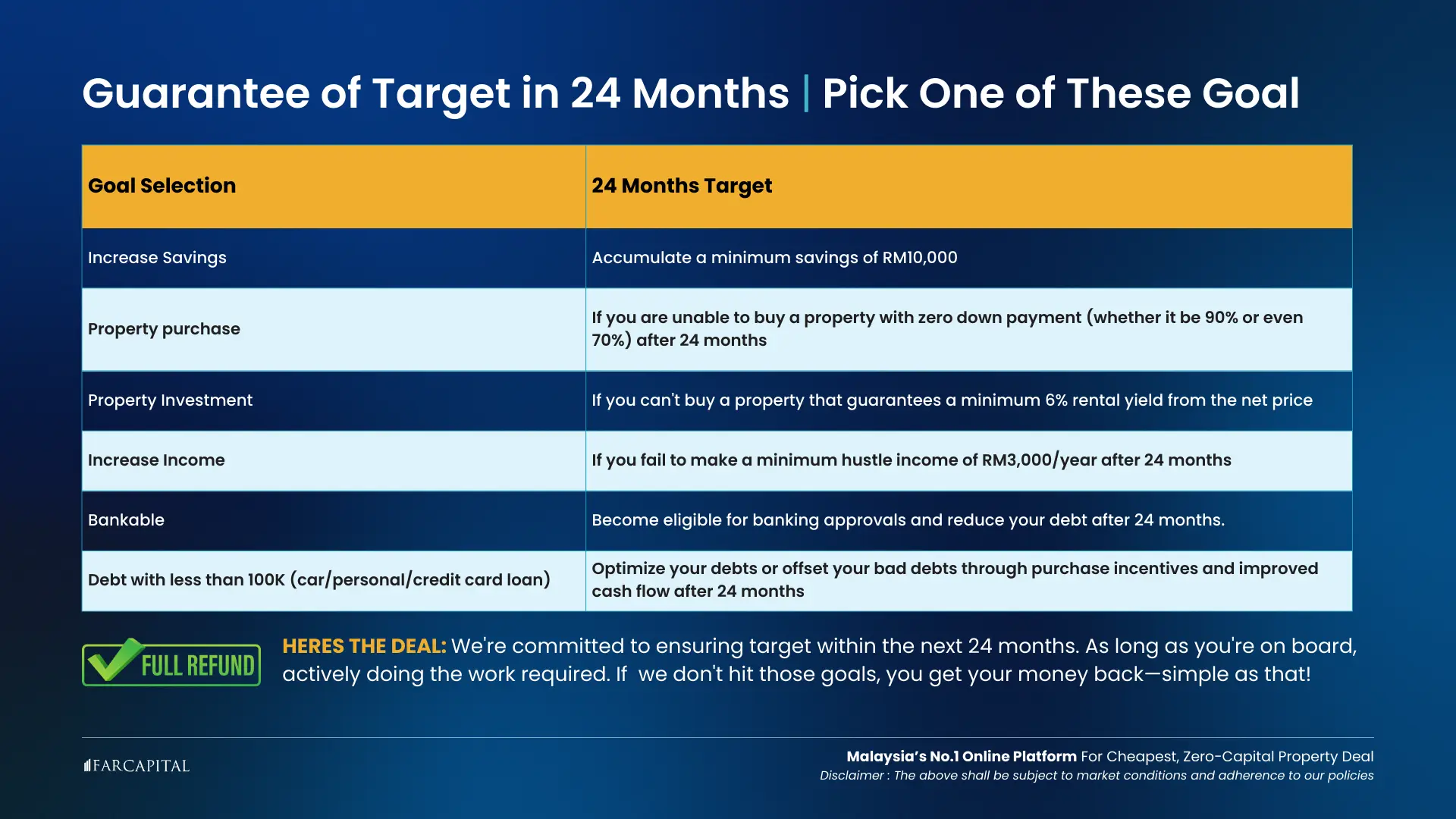 In order to purchase a property as soon as possible, it’s best for your net salary to be RM 3,500 and above (RM 4,500 and above for household income). But if your salary is currently lower than that - you can still become a FAR Capital client, but you may not be able to purchase a property immediately. You would have to work on reducing your monthly commitment or increasing your income, but it would be great cause you can start learning and observing how other FAR Capital clients build their portfolio, so that the moment your loan eligibility is sufficient, you’re truly ready to start investing in properties.
